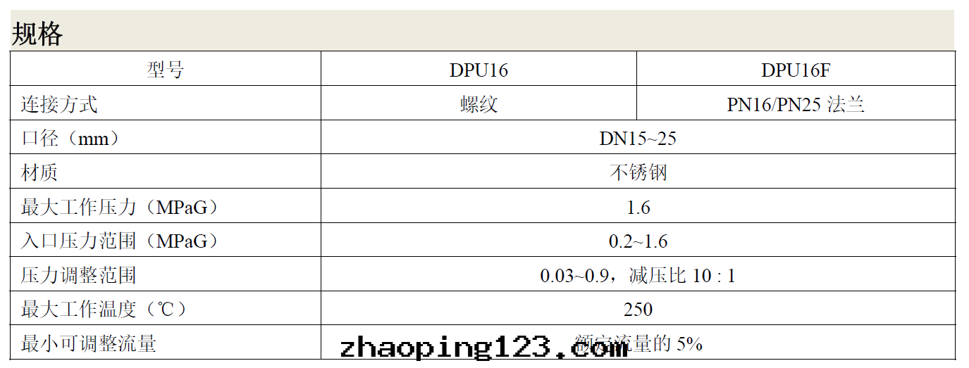 适用(yòng)于(yú)緊湊型小設備前(qián)蒸汽減壓,也可(kě)用(yòng)于(yú)空(kōng)气(qì)減壓。 型号(hào):DPU16、DPU16F 閥門(mén)材質(zhì):不(bù)鏽鋼(gāng) 最(zuì)大(dà)工作(zuò)壓力:1.6MPa 最(zuì)高(gāo)工作(zuò)温(wēn)度(dù):250℃
