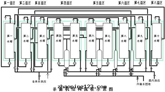 生(shēng)啤酒(jiǔ)裝(zhuāng)瓶(píng)封(fēng)口(kǒu)后,進(jìn)入(rù)殺菌機(jī)預热段(duàn),随傳送带(dài)逐次(cì)經(jīng)殺菌段(duàn)和(hé)冷(lěng)卻段(duàn),再由(yóu)另(lìng)一(yī)端離開(kāi)殺菌機(jī)。需要(yào)的(de)温(wēn)度要(yào)求:八(bā)个温(wēn)區(qū),温(wēn)度分(fēn)别为(wèi)37℃、48℃、61℃、72℃、66℃、48℃和(hé)37℃,行程43.5分(fēn)鐘(zhōng);蒸汽壓力一(yī)般5-6barg。