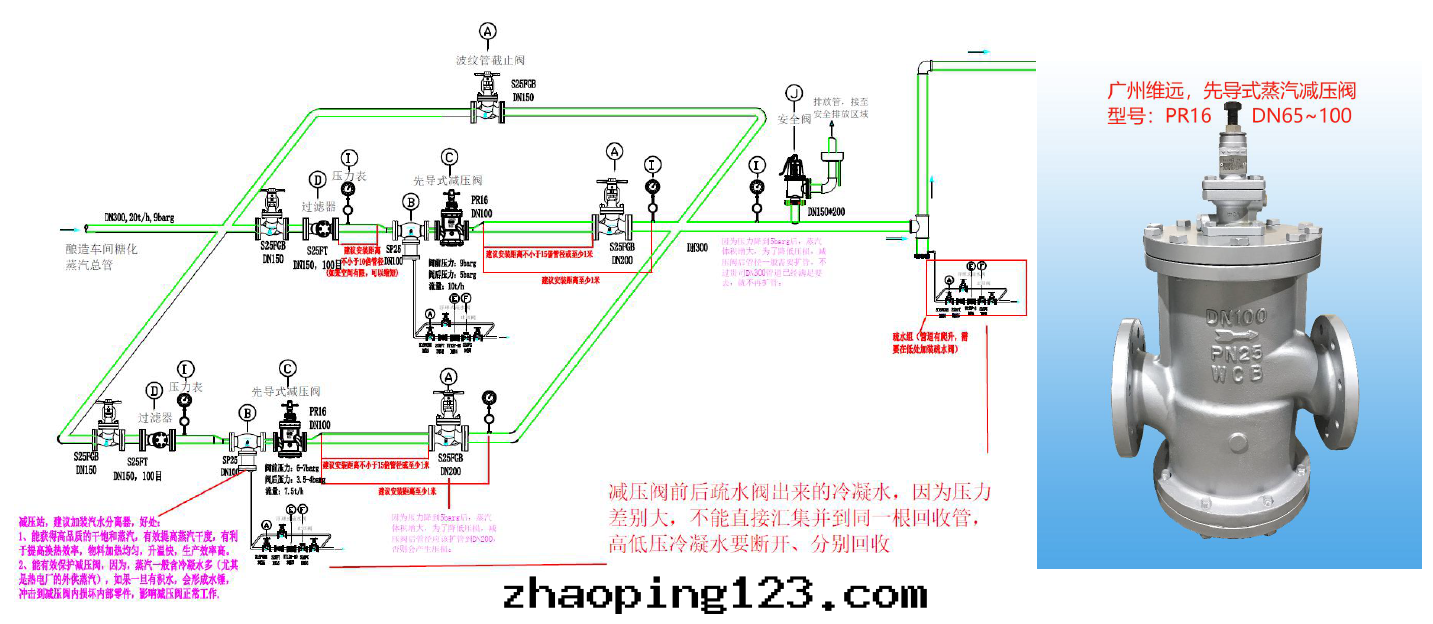 如(rú)果(guǒ)不(bù)並(bìng)聯,则需要(yào)選用(yòng)1个DN150減壓閥,但是(shì)这(zhè)个会(huì)存在(zài)一(yī)个問(wèn)題(tí),當車間(jiān)的(de)設備不(bù)是(shì)同(tóng)时使用(yòng),實(shí)際流量(liàng)比較少(shǎo)的(de)时候(比如(rú)只(zhī)開(kāi)1个加热罐,流量(liàng)只(zhī)有(yǒu)1t/h),这(zhè)时DN150減壓閥就(jiù)顯得过(guò)大(dà),而(ér)減壓閥選型过(guò)大(dà),会(huì)導致(zhì)減壓閥后的(de)壓力穩定(dìng)性(xìng)降低(dī),有(yǒu)波(bō)動(dòng),使用(yòng)寿命也(yě)会(huì)縮短(duǎn)(因(yīn)为(wèi)減壓閥經(jīng)常在(zài)比較小的(de)開(kāi)度範围內(nèi)使用(yòng),閥杆頻繁上下(xià)動(dòng)作(zuò),蒸汽流速大(dà)增,对(duì)密封(fēng)面(miàn)的(de)沖蝕相應(yìng)大(dà)增,长(cháng)期(qī)沖蝕使得密封(fēng)面(miàn)被(bèi)破壞,洩漏量(liàng)增大(dà),進(jìn)而(ér)造成(chéng)壓力不(bù)穩,閥門(mén)寿命縮短(duǎn))。