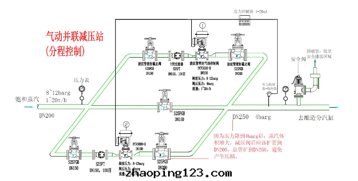 解(jiě)決方(fāng)案(àn)二(èr),采用(yòng)两(liǎng)个DN100的(de)波(bō)紋管(guǎn)密封(fēng)气(qì)動(dòng)控制閥並(bìng)聯,分(fēn)程控制(气(qì)動(dòng)並(bìng)聯減壓站):