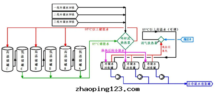 考慮到(dào)节(jié)能降耗,現(xiàn)在(zài)每家(jiā)啤酒(jiǔ)廠(chǎng)都非(fēi)常重(zhòng)視釀造車間(jiān)的(de)冷(lěng)凝水(shuǐ)回(huí)收(shōu)和(hé)二(èr)次(cì)利用(yòng),多(duō)餘的(de)還(huán)可(kě)以(yǐ)送到(dào)包(bāo)裝(zhuāng)車間(jiān)去(qù),給(gěi)洗瓶(píng)機(jī)和(hé)殺菌機(jī)使用(yòng),这(zhè)一(yī)块(kuài)暫不(bù)讨論,下(xià)图(tú)供參考!