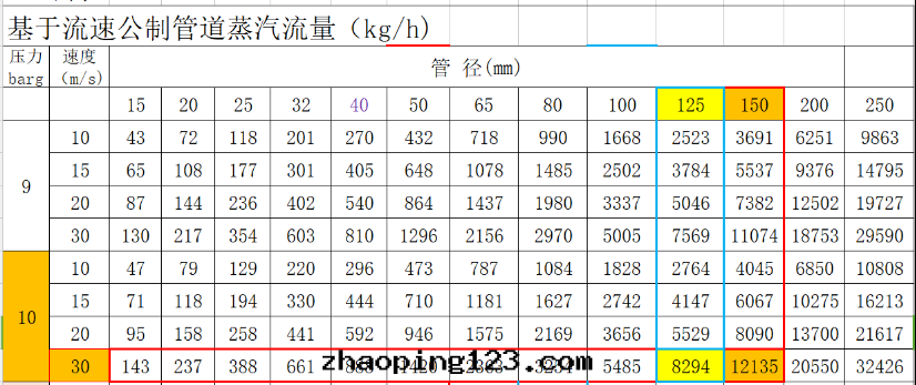 從下(xià)表(biǎo)查出(chū),10barg壓力时,DN150蒸汽管(guǎn)道(dào)的(de)最(zuì)大(dà)流量(liàng)为(wèi)12135kg/h,滿足要(yào)求,DN125管(guǎn)道(dào)的(de)流量(liàng)只(zhī)有(yǒu)8294kg/h,偏小。