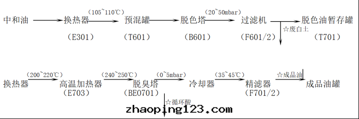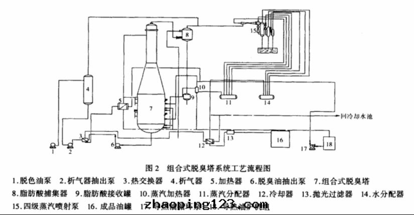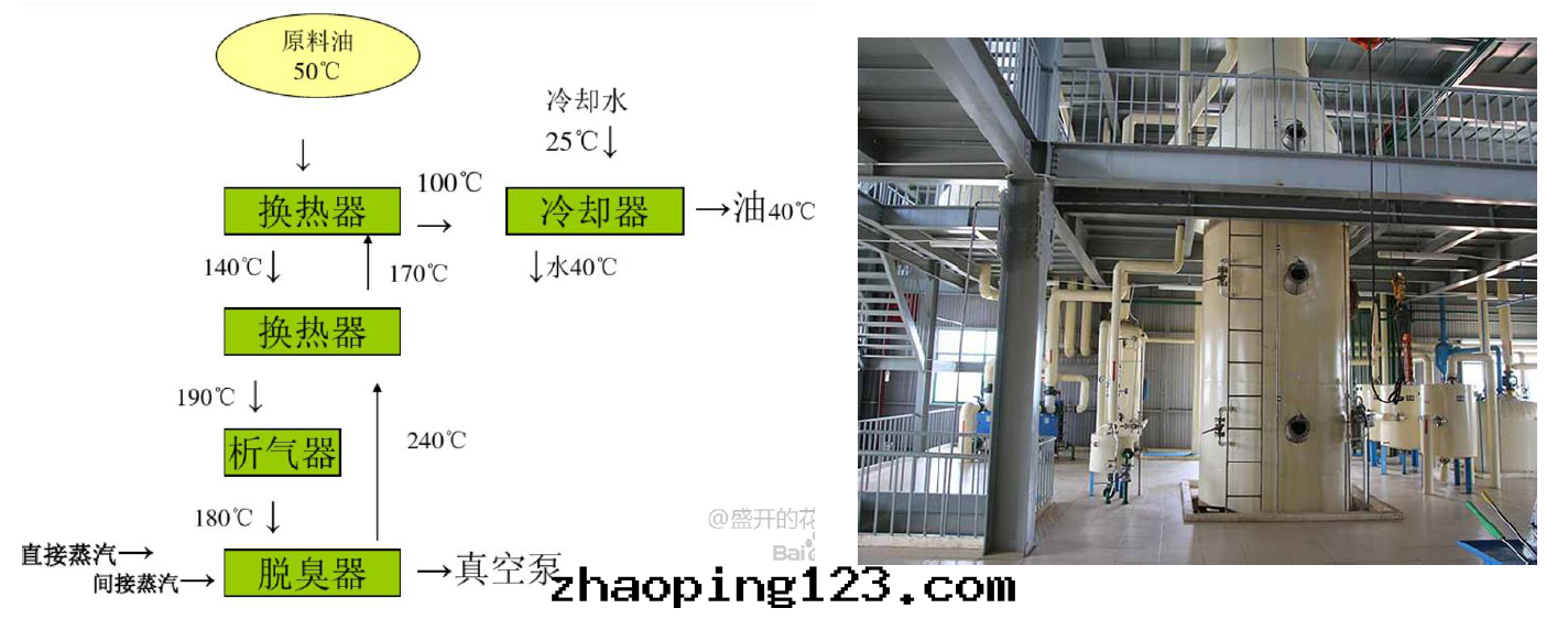 脫臭工藝:是(shì)指在(zài)真(zhēn)空(kōng)条(tiáo)件(jiàn)下(xià)将直(zhí)接蒸汽通(tòng)过(guò)油(yóu)脂而(ér)带(dài)走(zǒu)一(yī)些(xiē)异(yì)味物(wù)質(zhì)。脫色(sè)后的(de)油(yóu)通(tòng)过(guò)泵以(yǐ)恒定(dìng)的(de)流量(liàng)泵入(rù)0.4kpa高(gāo)真(zhēn)空(kōng)度的(de)析气(qì)器中(zhōng),油(yóu)通(tòng)过(guò)進(jìn)料管(guǎn)上的(de)多(duō)个喷嘴喷出(chū),使油(yóu)中(zhōng)滲入(rù)的(de)少(shǎo)量(liàng)空(kōng)气(qì)被(bèi)釋放。油(yóu)從析气(qì)器中(zhōng)出(chū)来(lái),被(bèi)泵入(rù)油(yóu)--油(yóu)热交換器,與(yǔ)從脫臭塔出(chū)来(lái)的(de)热脫臭油(yóu)進(jìn)行热交換,待脫臭油(yóu)被(bèi)加热到(dào)至(zhì)少(shǎo)180℃,然后流入(rù)290℃的(de)導热油(yóu)(或(huò)高(gāo)壓蒸汽)加热器,被(bèi)加热到(dào)260℃,这(zhè)个就(jiù)是(shì)高(gāo)温(wēn)的(de)待脫臭油(yóu),從導热油(yóu)加热器進(jìn)入(rù)到(dào)組合式脫臭塔中(zhōng),在(zài)填料段(duàn)中(zhōng)用(yòng)直(zhí)接蒸汽汽提(tí)出(chū)脂肪酸(suān)和(hé)其(qí)它(tā)相对(duì)易揮發(fà)的(de)臭味物(wù)質(zhì)(脫酸(suān)),再進(jìn)入(rù)闆式段(duàn)脫臭和(hé)热脫色(sè)。脫酸(suān)脫臭后的(de)油(yóu)從組合式脫臭塔中(zhōng)排出(chū),泵入(rù)热交換器與(yǔ)待脫臭油(yóu)進(jìn)行热交換,再進(jìn)入(rù)冷(lěng)卻器,被(bèi)水(shuǐ)冷(lěng)卻,冷(lěng)卻后油(yóu)温(wēn)不(bù)高(gāo)于(yú)70℃,最(zuì)后通(tòng)过(guò)精濾器后存入(rù)成(chéng)品油(yóu)儲存罐。
