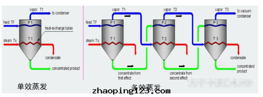 單效蒸發(fà)器的(de)蒸汽直(zhí)接去(qù)冷(lěng)凝,而(ér)多(duō)效蒸發(fà)器前面(miàn)效体的(de)二(èr)次(cì)蒸汽繼續利用(yòng)以(yǐ)节(jié)約能耗。