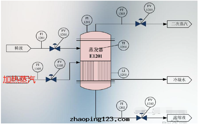 2、流程分(fēn)析:從上图(tú)可(kě)知,要(yào)同(tóng)时控制蒸發(fà)器內(nèi)温(wēn)度、壓力和(hé)溶液濃度,需要(yào)安(ān)裝(zhuāng)4个气(qì)動(dòng)控制閥,分(fēn)别为(wèi):