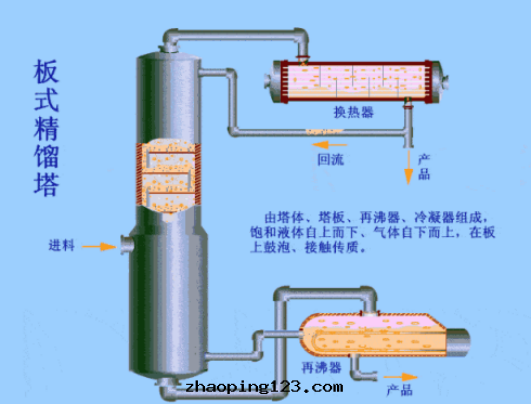 精餾过(guò)程的(de)主要(yào)設備有(yǒu):精餾塔、再沸器、冷(lěng)凝器、回(huí)流罐和(hé)輸送設備等。精餾塔以(yǐ)進(jìn)料闆为(wèi)界,上部(bù)为(wèi)精餾段(duàn),下(xià)部(bù)为(wèi)提(tí)餾段(duàn)。一(yī)定(dìng)温(wēn)度和(hé)壓力的(de)混合料液進(jìn)入(rù)精餾塔后,輕(qīng)組分(fēn)在(zài)精餾段(duàn)向(xiàng)上逐漸濃縮,離開(kāi)塔頂后全(quán)部(bù)冷(lěng)凝進(jìn)入(rù)回(huí)流罐,一(yī)部(bù)分(fēn)作(zuò)为(wèi)塔頂産品(也(yě)叫餾出(chū)液),另(lìng)一(yī)部(bù)分(fēn)被(bèi)送入(rù)塔內(nèi)作(zuò)为(wèi)回(huí)流液。回(huí)流液的(de)目的(de)是(shì)補充塔闆上的(de)輕(qīng)組分(fēn),使塔闆上的(de)液体組成(chéng)保持穩定(dìng),保證精餾操作(zuò)連(lián)續穩定(dìng)地(dì)進(jìn)行。而(ér)重(zhòng)組分(fēn)在(zài)提(tí)餾段(duàn)中(zhōng)向(xiàng)下(xià)濃縮后,一(yī)部(bù)分(fēn)作(zuò)为(wèi)塔釜産品(也(yě)叫殘液),一(yī)部(bù)分(fēn)则經(jīng)再沸器加热后送回(huí)塔中(zhōng),为(wèi)精餾操作(zuò)提(tí)供定(dìng)量(liàng)連(lián)續上升的(de)蒸气(qì)气(qì)流。