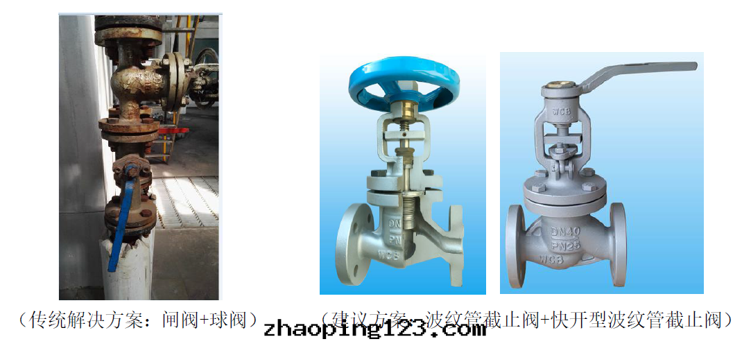 采用(yòng)1个慢(màn)排(用(yòng)波(bō)紋管(guǎn)截止閥S25FGB)+1个快排(快開(kāi)型波(bō)紋管(guǎn)截止閥S25FGB-1)組合。