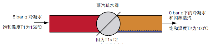 換句(jù)話(huà)说,當热(rè)的冷(lěng)凝水(shuǐ)排放(fàng)到(dào)低(dī)壓的环(huán)境中(zhōng),它(tā)的热(rè)焓(總(zǒng)热(rè)量(liàng))保持(chí)不(bù)變(biàn),但飽和(hé)温(wēn)度(dù)降低(dī)(水(shuǐ)的气(qì)态和(hé)液态共(gòng)存的温(wēn)度(dù))。为(wèi)了保持(chí)總(zǒng)热(rè)量(liàng)不(bù)變(biàn),部(bù)分(fēn)的水(shuǐ)吸收(shōu)了热(rè)量(liàng)蒸發(fà)成(chéng)蒸汽。