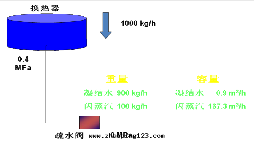 因(yīn)此(cǐ),低(dī)壓側的冷(lěng)凝水(shuǐ)的能(néng)量(liàng)同(tóng)樣(yàng)也是(shì)671 KJ/kg,但是(shì),0 bar g的水(shuǐ)中(zhōng)最(zuì)多(duō)含有(yǒu)419kJ/kg热(rè)量(liàng),低(dī)壓側的能(néng)量(liàng)就(jiù)與(yǔ)高(gāo)壓側不(bù)平衡,多(duō)出(chū)671-419 = 252 /kg这樣(yàng),对(duì)于(yú)水(shuǐ)来(lái)说,就(jiù)会产生(shēng)过热(rè)。这些(xiē)多(duō)出(chū)来(lái)的热(rè)量(liàng)就(jiù)会使部(bù)分(fēn)冷(lěng)凝水(shuǐ)沸騰形成(chéng)閃蒸蒸汽,这个(gè)沸騰的过程就(jiù)叫閃蒸。因(yīn)此(cǐ),原来(lái)存在(zài)于(yú)高(gāo)壓側冷(lěng)凝水(shuǐ)中(zhōng)的能(néng)量(liàng)現(xiàn)在(zài)就(jiù)存在(zài)于(yú)低(dī)壓側的水(shuǐ)和(hé)蒸汽的混合物(wù)之(zhī)中(zhōng)了。