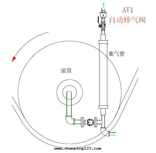 C、干燥滾筒(造纸和(hé)印(yìn)染行業):在(zài)水(shuǐ)平滾筒旋轉(zhuǎn)軸的一(yī)側通(tòng)入(rù)蒸汽,物(wù)料和(hé)滾筒的外表(biǎo)面(miàn)接觸進(jìn)行加热(rè)干燥,冷(lěng)凝水(shuǐ)通(tòng)过虹(hóng)吸管(guǎn)經(jīng)过滾筒旋轉(zhuǎn)軸蒸汽的同(tóng)一(yī)進(jìn)口(kǒu)側或(huò)滾筒的另(lìng)一(yī)側排出(chū)。由(yóu)于(yú)滾筒比較大(dà),所(suǒ)以(yǐ)在(zài)啟動(dòng)階(jiē)段(duàn)要(yào)排除的空(kōng)气(qì)量(liàng)也很大(dà),在(zài)正(zhèng)常工作(zuò)情(qíng)況下,空(kōng)气(qì)会積聚並(bìng)引起(qǐ)滾筒外表(biǎo)面(miàn)出(chū)現(xiàn)冷(lěng)區(qū),導致(zhì)制程中(zhōng)的物(wù)料出(chū)現(xiàn)質(zhì)量(liàng)問(wèn)題(tí),所(suǒ)以(yǐ)自(zì)動(dòng)排空(kōng)气(qì)閥很重(zhòng)要(yào),如(rú)果(guǒ)要(yào)达(dá)到(dào)理(lǐ)想(xiǎng)效果(guǒ)理(lǐ)應(yìng)安(ān)裝(zhuāng)排空(kōng)气(qì)閥。