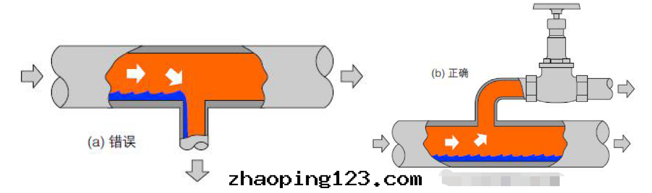 5、從主(zhǔ)管(guǎn)道(dào)上(shàng)取(qǔ)汽,應(yìng)該從主(zhǔ)管(guǎn)頂部(bù)接分(fēn)支管(guǎn),这樣(yàng)可(kě)以(yǐ)得到(dào)最(zuì)干燥的蒸汽;若從底部(bù)取(qǔ)汽,冷(lěng)凝水(shuǐ)和(hé)雜質(zhì)全(quán)部(bù)跟随蒸汽往下遊輸送,影響設備有(yǒu)效運行。