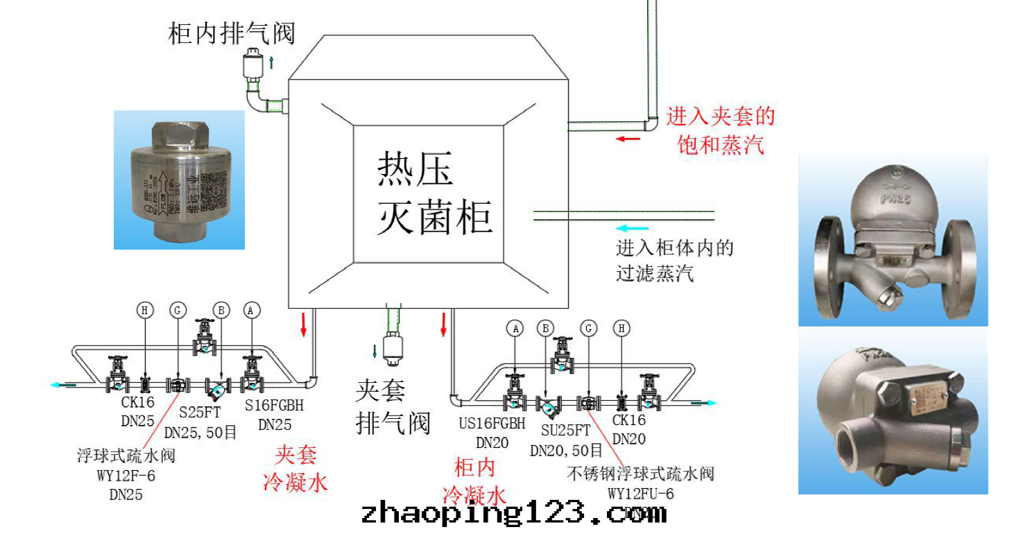常用(yòng)的滅菌方(fāng)法(fǎ)有(yǒu)蒸汽湿(shī)热(rè)滅菌法(fǎ)、干热(rè)滅菌法(fǎ)、气(qì)體(tǐ)滅菌法(fǎ)、輻射滅菌法(fǎ)和(hé)过濾除菌法(fǎ)。这里(lǐ)主(zhǔ)要(yào)说说比較常用(yòng)的湿(shī)热(rè)滅菌櫃(如(rú)热(rè)壓滅菌和(hé)蒸汽流通(tòng)滅菌),冷(lěng)凝水(shuǐ)比較少(shǎo),正(zhèng)常使用(yòng)DN25浮球式疏水(shuǐ)閥即可(kě);因(yīn)为(wèi)進(jìn)入(rù)櫃體(tǐ)內(nèi)的蒸汽为(wèi)衛生(shēng)的过濾蒸汽,所(suǒ)以(yǐ)对(duì)應(yìng)的疏水(shuǐ)閥建議用(yòng)不(bù)鏽鋼(gāng)材質(zhì)的。