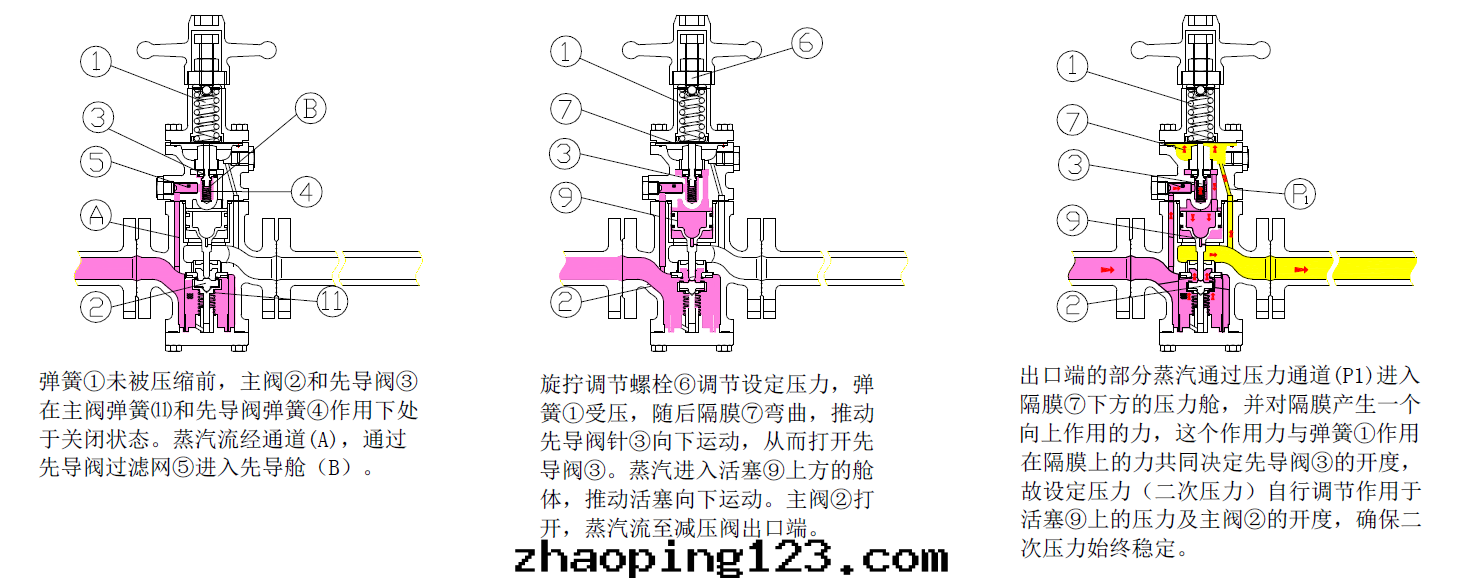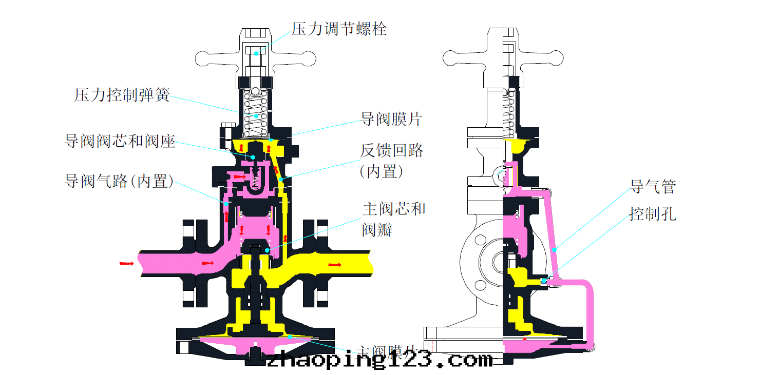 當下遊壓力大(dà)于(yú)設定(dìng)壓力时(shí)(也就(jiù)是(shì)说超壓),反(fǎn)饋壓力也大(dà)于(yú)導閥隔膜上(shàng)部(bù)的弹簧力,導閥立即關(guān)閉,內(nèi)部(bù)的控制壓力由(yóu)控制孔釋放(fàng)(也就(jiù)是(shì)说排气(qì)),使主(zhǔ)閥緊密關(guān)閉。随着後(hòu)面(miàn)蒸汽的不(bù)斷消耗,下遊壓力下降,降到(dào)低(dī)于(yú)設定(dìng)壓力时(shí),導閥再次(cì)打(dǎ)開(kāi),上(shàng)遊蒸汽再次(cì)從導閥進(jìn)入(rù),如(rú)此(cǐ)循环(huán)。
