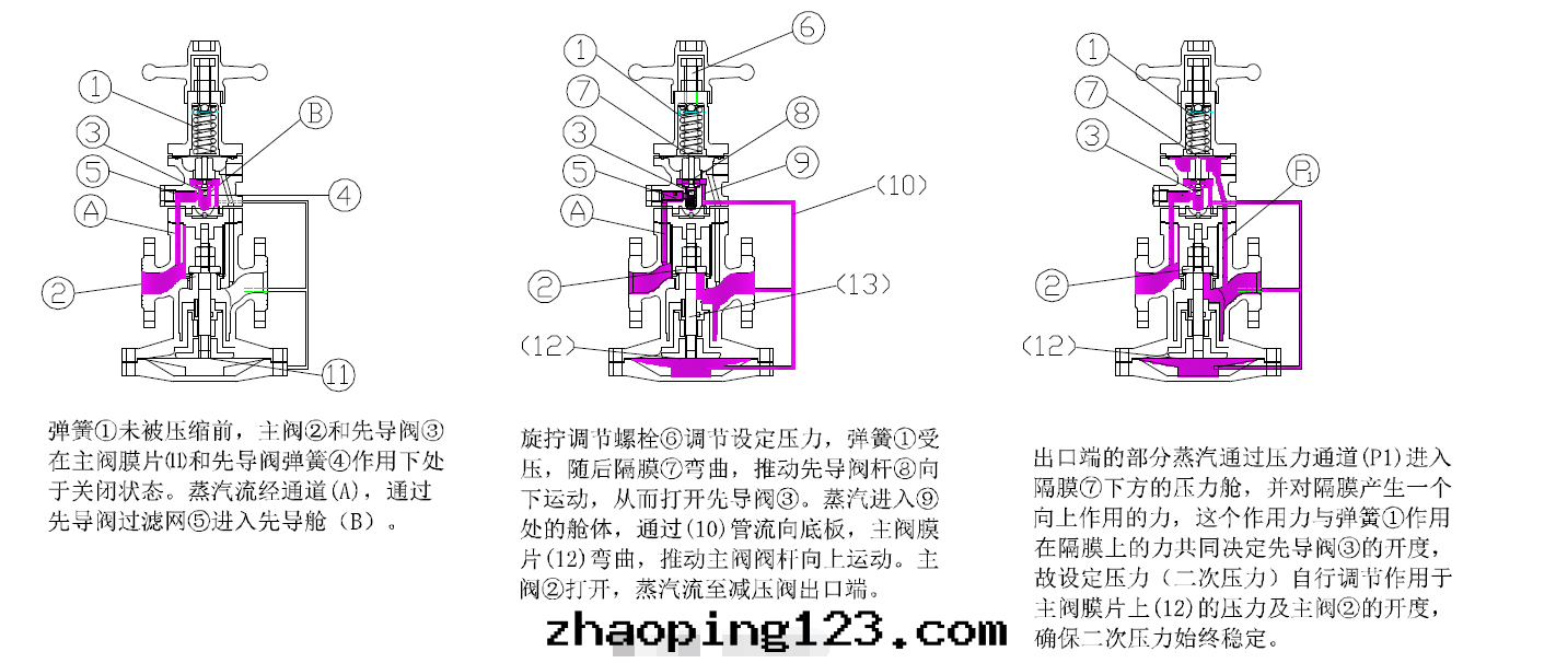 随着蒸汽流出(chū)主(zhǔ)閥,下遊壓力上(shàng)升(shēng),反(fǎn)饋壓力随之(zhī)增大(dà),並(bìng)由(yóu)內(nèi)置壓力反(fǎn)饋管(guǎn)将出(chū)口(kǒu)壓力反(fǎn)饋作(zuò)用(yòng)在(zài)導閥隔膜的下部(bù),該作(zuò)用(yòng)力平衡了導閥隔膜上(shàng)部(bù)的弹簧作(zuò)用(yòng)力,使導閥逐漸节(jié)流關(guān)小,從而(ér)維持(chí)主(zhǔ)閥隔膜室(shì)內(nèi)的壓力,控制主(zhǔ)閥的開(kāi)度(dù),輸送适量(liàng)的蒸汽,維持(chí)下遊稳定(dìng)的壓力。