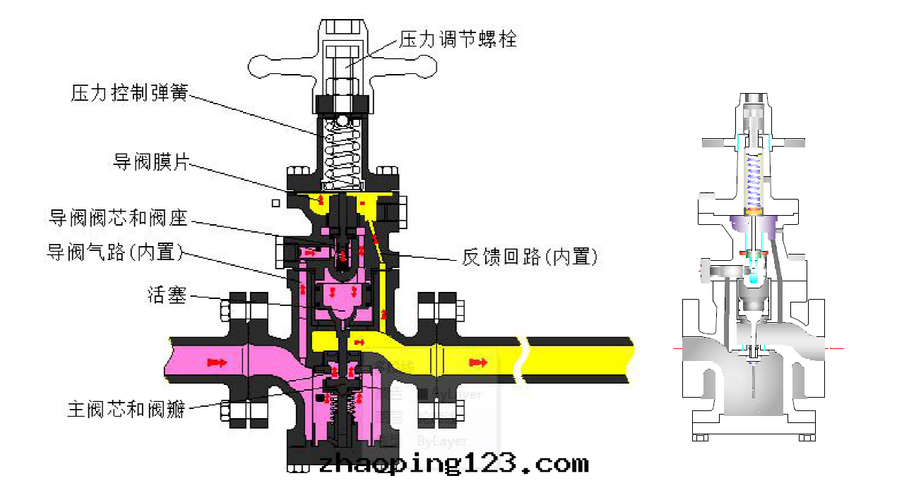 當蒸汽進(jìn)来(lái)後(hòu),首先(xiān)進(jìn)入(rù)導閥腔,因(yīn)为(wèi)減壓閥已經(jīng)設定(dìng)好(hǎo)壓力,因(yīn)此(cǐ)導閥膜片(piàn)已經(jīng)受到(dào)了調节(jié)弹簧向(xiàng)下的預設定(dìng)作(zuò)用(yòng)力,導閥已經(jīng)打(dǎ)開(kāi),當蒸汽進(jìn)入(rù)導閥腔後(hòu),直(zhí)接就(jiù)進(jìn)入(rù)到(dào)活塞上(shàng)方(fāng)的腔體(tǐ),推動(dòng)活塞向(xiàng)下運動(dòng),将主(zhǔ)閥打(dǎ)開(kāi),此(cǐ)时(shí)蒸汽進(jìn)入(rù)到(dào)減壓閥出(chū)口(kǒu)端。出(chū)口(kǒu)端的部(bù)分(fēn)蒸汽通(tòng)过反(fǎn)饋導管(guǎn)進(jìn)入(rù)到(dào)導閥膜片(piàn)的下方(fāng),給(gěi)膜片(piàn)一(yī)个(gè)向(xiàng)上(shàng)的作(zuò)用(yòng)力,这个(gè)作(zuò)用(yòng)力與(yǔ)弹簧力共(gòng)同(tóng)決定(dìng)導閥的開(kāi)度(dù),这開(kāi)度(dù)決定(dìng)了減壓閥出(chū)口(kǒu)的壓力,出(chū)口(kǒu)壓力反(fǎn)过来(lái)決定(dìng)着主(zhǔ)閥的開(kāi)度(dù),主(zhǔ)閥開(kāi)度(dù)的調整可(kě)以(yǐ)控制進(jìn)汽的流量(liàng),如(rú)此(cǐ)循环(huán),这種(zhǒng)根(gēn)據(jù)設定(dìng)壓力自(zì)行調节(jié)的先(xiān)導式減壓閥,可(kě)以(yǐ)确保二(èr)次(cì)壓力始终稳定(dìng)。