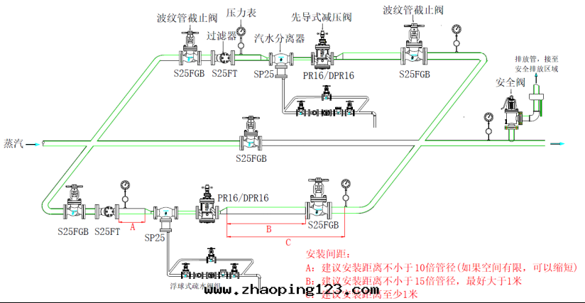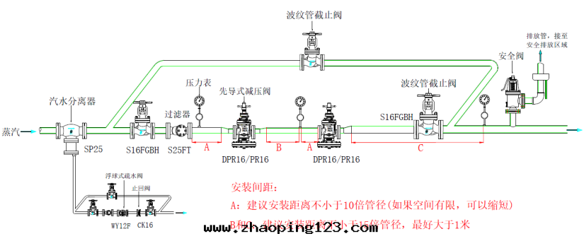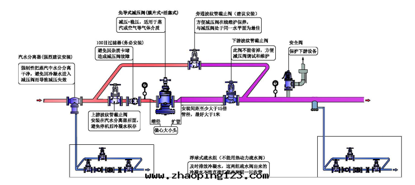 1、 对(duì)于(yú)連(lián)續生(shēng)产的工況,減壓閥前(qián)3米(mǐ)內(nèi)建議安(ān)裝(zhuāng)汽水(shuǐ)分(fēn)離器(如(rú)下图(tú)所(suǒ)示),否則,前(qián)端管(guǎn)路(lù)冷(lěng)凝水(shuǐ)会直(zhí)接進(jìn)入(rù)到(dào)減壓閥內(nèi),会对(duì)減壓閥內(nèi)部(bù)的弹簧、主(zhǔ)閥閥杆、活塞或(huò)膜片(piàn)等關(guān)鍵零(líng)部(bù)件(jiàn)造成(chéng)致(zhì)命傷害,進(jìn)而(ér)導致(zhì)減壓閥失效或(huò)损壞。