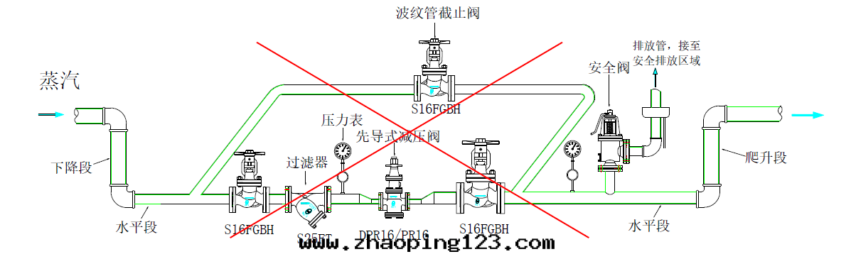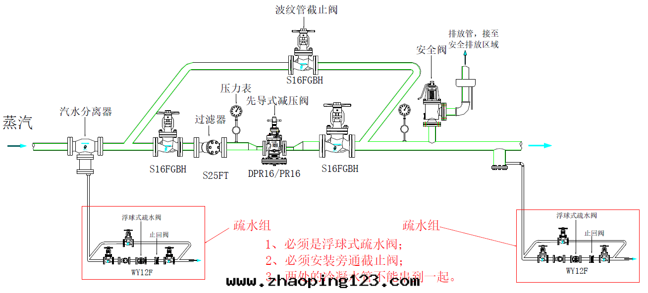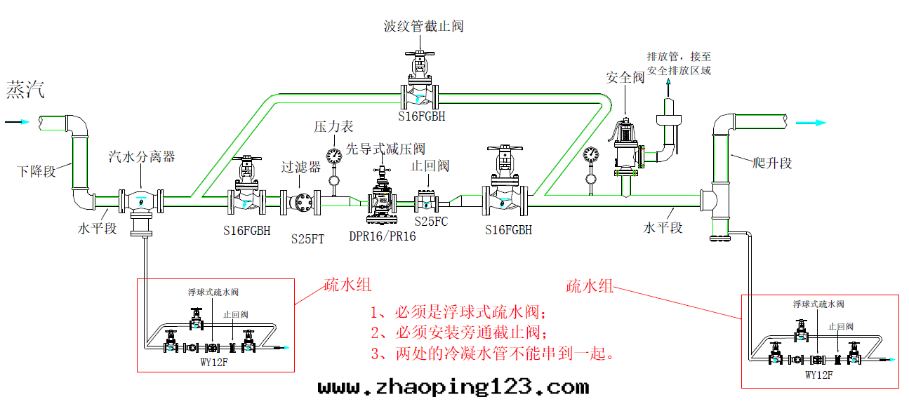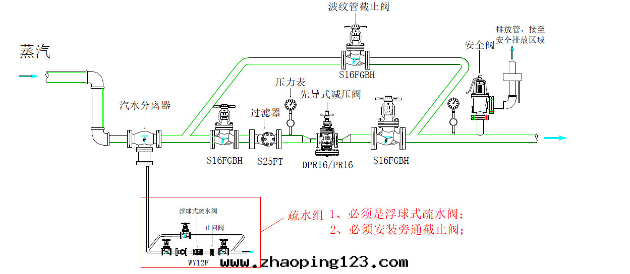 3、对(duì)于(yú)連(lián)續生(shēng)产的工況,若未能(néng)安(ān)裝(zhuāng)汽水(shuǐ)分(fēn)離器,則至(zhì)少(shǎo)需要(yào)在(zài)管(guǎn)路(lù)上(shàng)做一(yī)个(gè)集水(shuǐ)井(如(rú)果(guǒ)疏水(shuǐ)管(guǎn)道(dào)沒(méi)有(yǒu)做集水(shuǐ)井,冷(lěng)凝水(shuǐ)很難直(zhí)接進(jìn)入(rù)到(dào)疏水(shuǐ)管(guǎn)道(dào),而(ér)是(shì)直(zhí)接沖向(xiàng)後(hòu)面(miàn)的管(guǎn)道(dào)及(jí)減壓閥),安(ān)裝(zhuāng)疏水(shuǐ)組,而(ér)且(qiě)此(cǐ)疏水(shuǐ)閥不(bù)能(néng)使用(yòng)热(rè)動(dòng)力疏水(shuǐ)閥,必須是(shì)機(jī)械式疏水(shuǐ)閥(如(rú)自(zì)由(yóu)浮球疏水(shuǐ)閥),並(bìng)且(qiě)疏水(shuǐ)閥必須安(ān)裝(zhuāng)旁通(tòng),開(kāi)機(jī)前(qián)疏水(shuǐ)閥旁通(tòng)需開(kāi)啟直(zhí)至(zhì)冷(lěng)凝水(shuǐ)排盡为(wèi)止,若無旁通(tòng)則疏水(shuǐ)时(shí)間(jiān)至(zhì)少(shǎo)15分(fēn)鐘(zhōng)以(yǐ)上(shàng),确保冷(lěng)凝水(shuǐ)已排除干淨後(hòu)再打(dǎ)開(kāi)減壓閥前(qián)截止閥,否則可(kě)能(néng)造成(chéng)因(yīn)冷(lěng)凝水(shuǐ)進(jìn)入(rù)減壓閥而(ér)導致(zhì)減壓閥失效的嚴重(zhòng)問(wèn)題(tí)。(如(rú)下图(tú)所(suǒ)示)