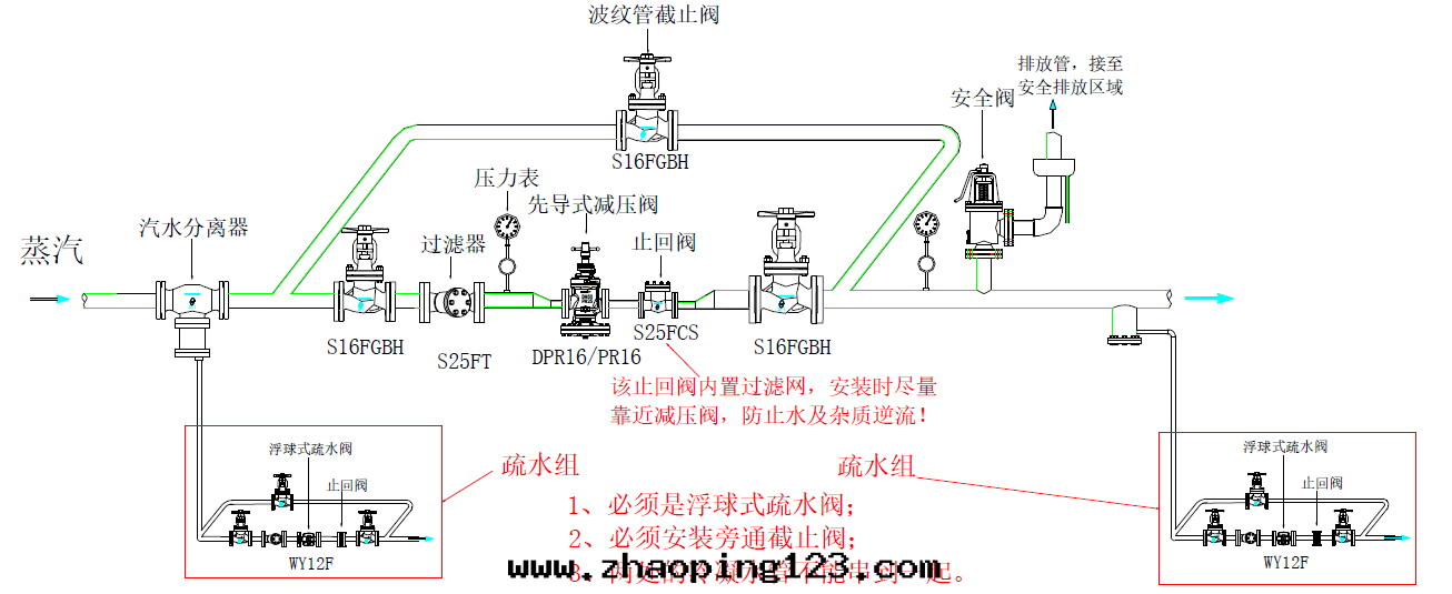 3、若未能(néng)安(ān)裝(zhuāng)汽水(shuǐ)分(fēn)離器,則至(zhì)少(shǎo)需要(yào)安(ān)裝(zhuāng)一(yī)个(gè)疏水(shuǐ)閥組,而(ér)且(qiě)此(cǐ)疏水(shuǐ)閥不(bù)能(néng)使用(yòng)热(rè)動(dòng)力疏水(shuǐ)閥,必須是(shì)機(jī)械式疏水(shuǐ)閥(如(rú)浮球疏水(shuǐ)閥),並(bìng)且(qiě)疏水(shuǐ)閥必須安(ān)裝(zhuāng)旁通(tòng),開(kāi)機(jī)前(qián)疏水(shuǐ)閥旁通(tòng)需開(kāi)啟直(zhí)至(zhì)冷(lěng)凝水(shuǐ)排盡为(wèi)止,若無旁通(tòng)則疏水(shuǐ)时(shí)間(jiān)至(zhì)少(shǎo)15分(fēn)鐘(zhōng)以(yǐ)上(shàng),确保冷(lěng)凝水(shuǐ)已排除干淨後(hòu)再打(dǎ)開(kāi)減壓閥前(qián)截止閥。