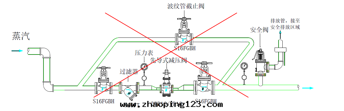 5、 若管(guǎn)道(dào)成(chéng)凹字(zì)形,即管(guǎn)道(dào)下降後(hòu)裝(zhuāng)減壓閥,然後(hòu)管(guǎn)道(dào)又爬升(shēng),除了在(zài)前(qián)端安(ān)裝(zhuāng)汽水(shuǐ)分(fēn)離器,後(hòu)端管(guǎn)路(lù)最(zuì)低(dī)点也要(yào)做一(yī)个(gè)集水(shuǐ)井,安(ān)裝(zhuāng)機(jī)械式疏水(shuǐ)閥,且(qiě)加旁通(tòng)閥,絕不(bù)能(néng)用(yòng)热(rè)動(dòng)力疏水(shuǐ)閥;同(tóng)时(shí)在(zài)減壓閥後(hòu)要(yào)加裝(zhuāng)止回(huí)閥,避免冷(lěng)凝水(shuǐ)回(huí)流進(jìn)減壓閥(所(suǒ)下图(tú)所(suǒ)示)。否則減壓閥会經(jīng)常性(xìng)出(chū)現(xiàn)因(yīn)積水(shuǐ)而(ér)造成(chéng)的減壓閥失效的嚴重(zhòng)問(wèn)題(tí)。